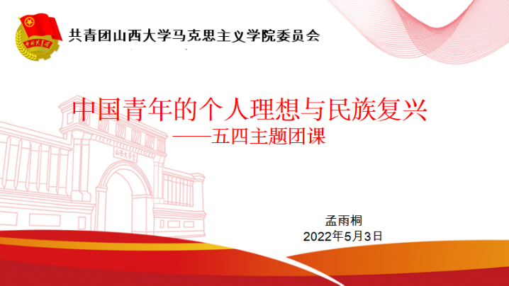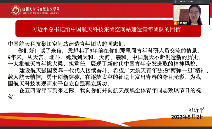 孟雨桐老师以《中国青年的个人理想与民族复兴》为题主讲五四主题团课。首先她以马克思的中学作文《青年在选择职业时的考虑》引入,结合即将到来的毕业季,提出就业选择是青年从公司走向社会时做出的第一个重要选择,马克思提示我们应该处理好个人利益和共同利益的关系。孟老师带领大家阅读梳理了《新时代的中国青年》白皮书的重点内容,介绍了新时代中国青年的发展环境、就业机遇、能力素质和责任担当。接下来,孟老师就互联网上讨论热烈的“内卷还是躺平”的问题,结合个人经历与大家做了交流分享,提出应该以“奋斗”的积极表述取代“内卷”的消极表述,当我们以自我实现和奉献社会为目标时,就不会为竞争和比较而焦虑。最后,她带领大家共同学习了习近平总书记5月2日给中国航天科技集团空间站建造青年团队的回信和4月25日在中国人民大学考察时的重要讲话,鼓励团员青年要将个人理想与民族复兴的使命相结合,让青春在奋斗中绽放光芒。