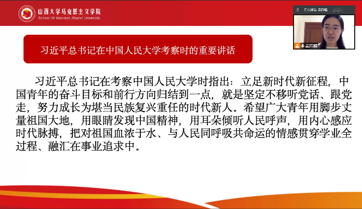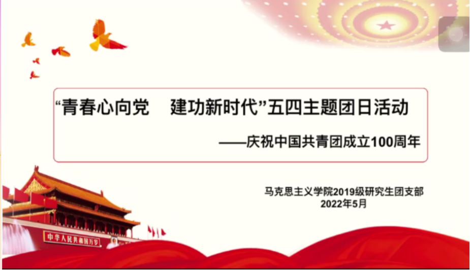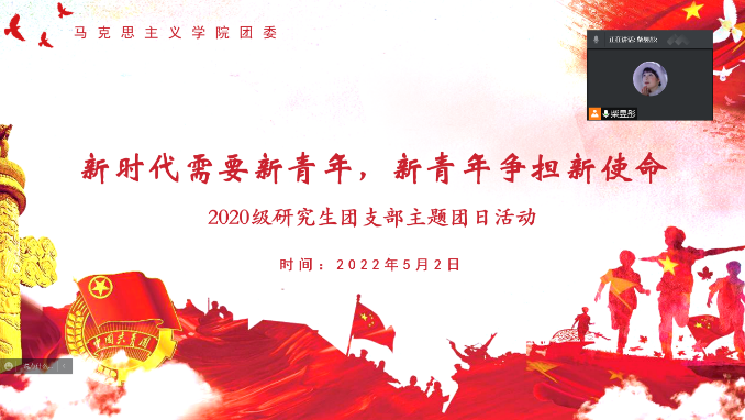 2020级研究生团支部围绕“新时代需要新青年,新青年争担新使命”开展主题团日活动。团支书柴昱彤以“那年的五四,那时的青年”、“这一代年轻人还有不计生死的血性吗”“如何争做堪当民族复兴重任的时代新人”三个问题引发团员青年的思考。支部团员从毛泽东、蔡和森、郭钦光、邓中夏等历史人物在五四运动时期的青春故事中,重温那一代青年的初心与使命;共同观看微电影《重逢》,感受新时代青年保家卫国的血性与勇气;共同学习习近平总书记在中国人民大学考察重要讲话精神,讨论如何在自己的学习生活中践行青年担当。大家纷纷表示,未来要更加坚定信仰,夯实理论基础,丰富专业素养,勇担时代责任,在助力国家重大活动、投身基层志愿服务、宣传党的创新理论成果的实践中,贡献马院学子的青春力量。