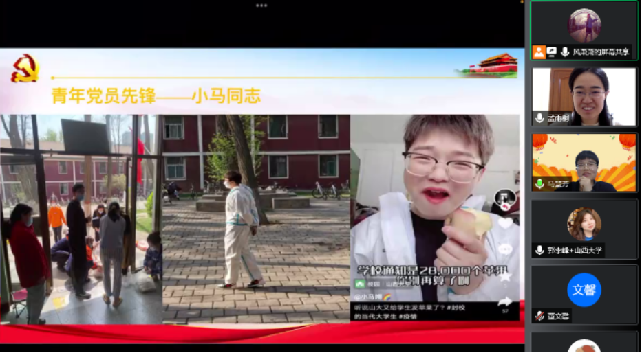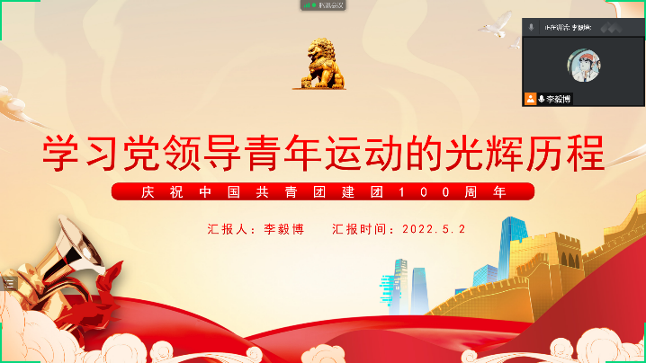 公司三个团支部分别开展线上主题团日活动。2019级研究生团支部共唱团歌、重温入团誓词,集体观看了庆祝中国共青团成立100周年主题宣传片《共青春》。在“我对团团有话说”环节中,高彩霞、秦盼盼两位同学结合自己的硕士论文,分享了百年团史中的英雄人物和重要事件。高彩霞讲述了中国共产党早期著名革命活动家、理论家高君宇在北大求学、五四运动中和回到山西创建党团组织的故事,秦盼盼描绘了1937年到1945年抗战时期根据地青年运动的发展。郭李峰则分享了当下这场疫情防控阻击战中涌现出的有为青年和感人故事,并特别邀请了体育公司2020级本科生马慧芳同学讲述自己在yl23411永利官网疫情防控期间主动担任文瀛八斋宿舍楼志愿者的经历。