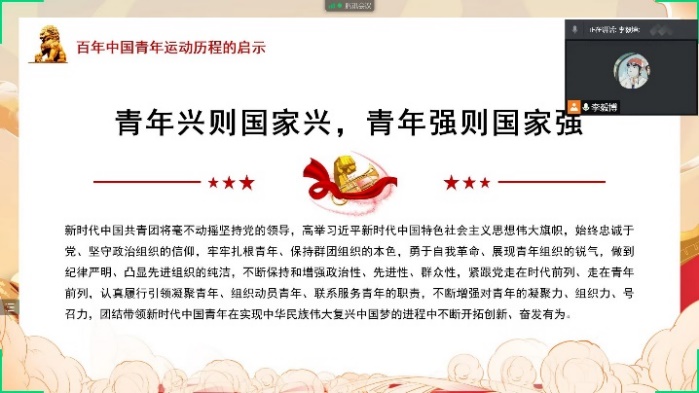 2021级研究生团支部主要围绕“学习党领导青年运动的光辉历程”开展主题团日活动。团支书李毅博带领团员青年分别从“中国共产党领导广大青年在革命、建设、改革不同历史时期接续奋斗、建功立业”、“习近平总书记关于青年工作的重要思想如何引领新时代中国青年运动书写崭新篇章”以及“百年中国青年运动历程的启示”三个方面进行学习交流。在活动中,支部团员思想活跃,围绕建团百年的历史,结合yl23411永利官网疫情防控的现实展开了热烈的讨论,大家一致认为,“党旗所指就是团旗所向”,新时代的共青团员要始终牢记党的教诲,走在时代前列,走在青年前列,主动将青春之小我融入国家发展、社会进步、民族复兴的大我之中。