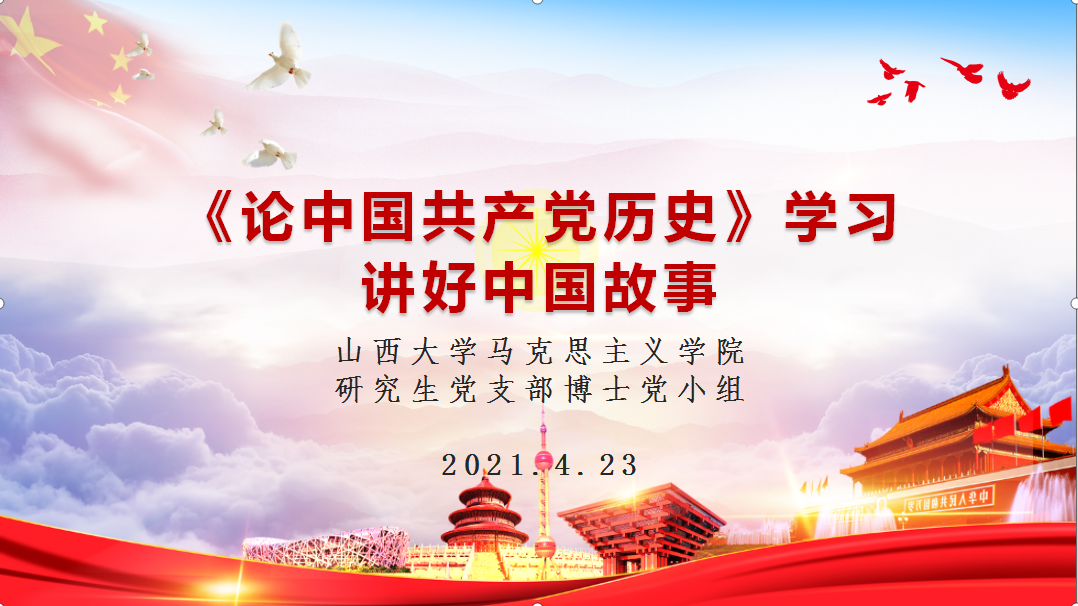 学习党的奋斗历史,传承党的奋斗精神。为了从学习党史中领悟新时代如何讲好中国故事、传播好中国声音,研究生党支部博士生党小组于2021年4月23日开展主题为“讲好中国故事”的专题学习。会议由博士党小组长邓嘉颖同志主持。