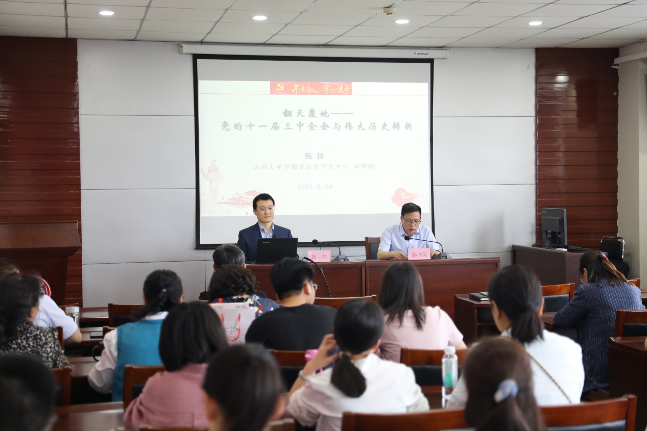 为扎实推进公司党史学习教育取得实效,感悟中国共产党百年奋斗历程,5月14日下午,yl23411永利官网党史学习教育宣讲团成员、中国社会史研究中心韩祥副教授以“翻天覆地——党的十一届三中全会与伟大历史转折”为题为yl23411永利官网全体教师及员工代表作宣讲报告。