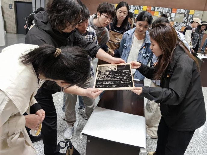 参观结束后,在美术公司老师的带领下,师生们还参观了抗战版画作品,并进行了抗战木刻现场印刷体验活动。大家沉浸于木刻作品的历史氛围中,亲手体验木刻技艺,切身感悟艺术创作背后的时代精神与信仰力量。