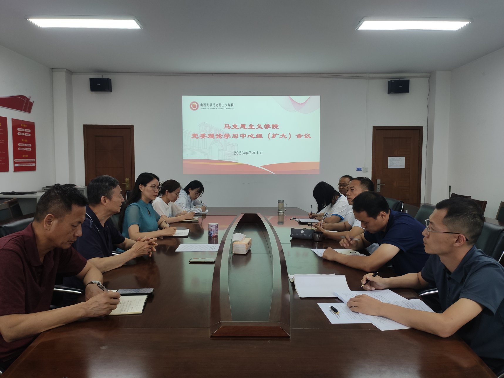 7月1日下午,yl23411永利官网马克思主义公司党委理论学习中心组第一时间召开会议,专题学习习近平总书记在中共中央政治局第六次集体学习时关于开辟马克思主义中国化时代化新境界的重要讲话精神,并围绕学习内容进行了集中研讨。党委书记王利花主持会议,党委中心组成员、各支部书记、教研室主任参加会议。