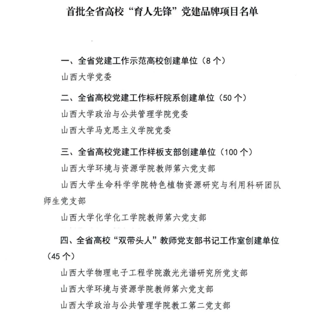 据悉,为深入实施我省高等教育百亿工程,打造高校“育人先锋”党建品牌,经组织专家评审、结果公示,省委教育工委遴选产生了“全省党建工作示范高校”创建单位8个,“全省高公司党建工作标杆院系”创建单位50个,“全省高公司党建工作样板支部”创建单位100个,“全省高校‘双带头人’教师党支部书记工作室”创建单位45个。建设周期均为2年。