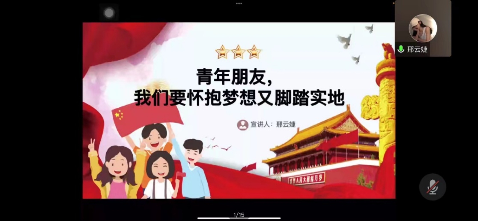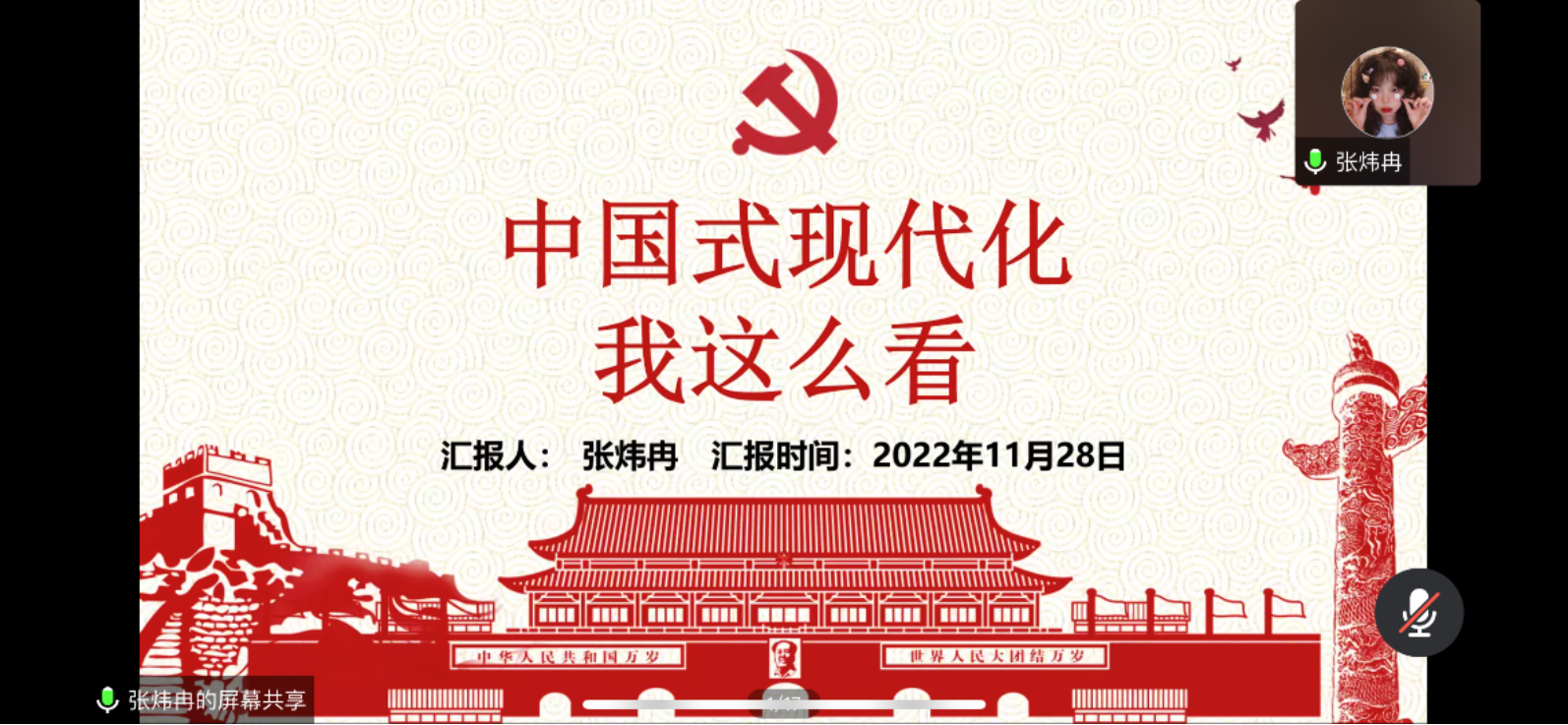 邢云婕同学以“青年朋友,我们要怀抱梦想又脚踏实地”为主题,结合党的二十大报告中习近平总书记对青年的寄语,通过分享中国不同历史时期的青年杰出人物,号召青年员工要勇于担当使命,直面时代挑战,学习青年中的先进模范,谱写人生的精彩华章。张炜冉同学以“中国式现代化,我这么看”为主题,围绕党的二十大报告中关于中国式现代化的重要论述,向同学们详细阐述了中国式现代化的五大特征、本质要求和实现路径,提出新时代中国青年作为祖国建设的生力军,对中国式现代化要知其然、知其所以然、知其必然,号召新时代青年要为实现中国式现代化目标奉献青春力量。
