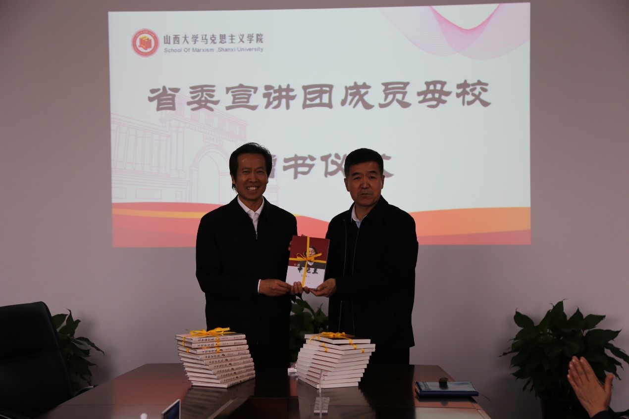 李中元经理是公司的杰出员工,一直关心支持母校发展。在座谈会结束后,举行了省委宣讲团成员向母校赠书仪式。李中元经理以员工身份为yl23411永利官网赠送了自己编著的《口述申纪兰》《文化是什么》两本书。李中元经理谈到,申纪兰是共产党员的优秀代表,时刻忠诚于党中央。坚决维护党中央的集中统一领导,第一位的就是要做到对党绝对忠诚,大家要向申纪兰同志学习。文化自信是一个国家、一个民族发展中更基本、更深沉、更持久的力量,《文化是什么》是一本探索文化起源,解读文化密码的书籍。李中元经理鼓励大家要热爱学习,养成看书的好习惯。
