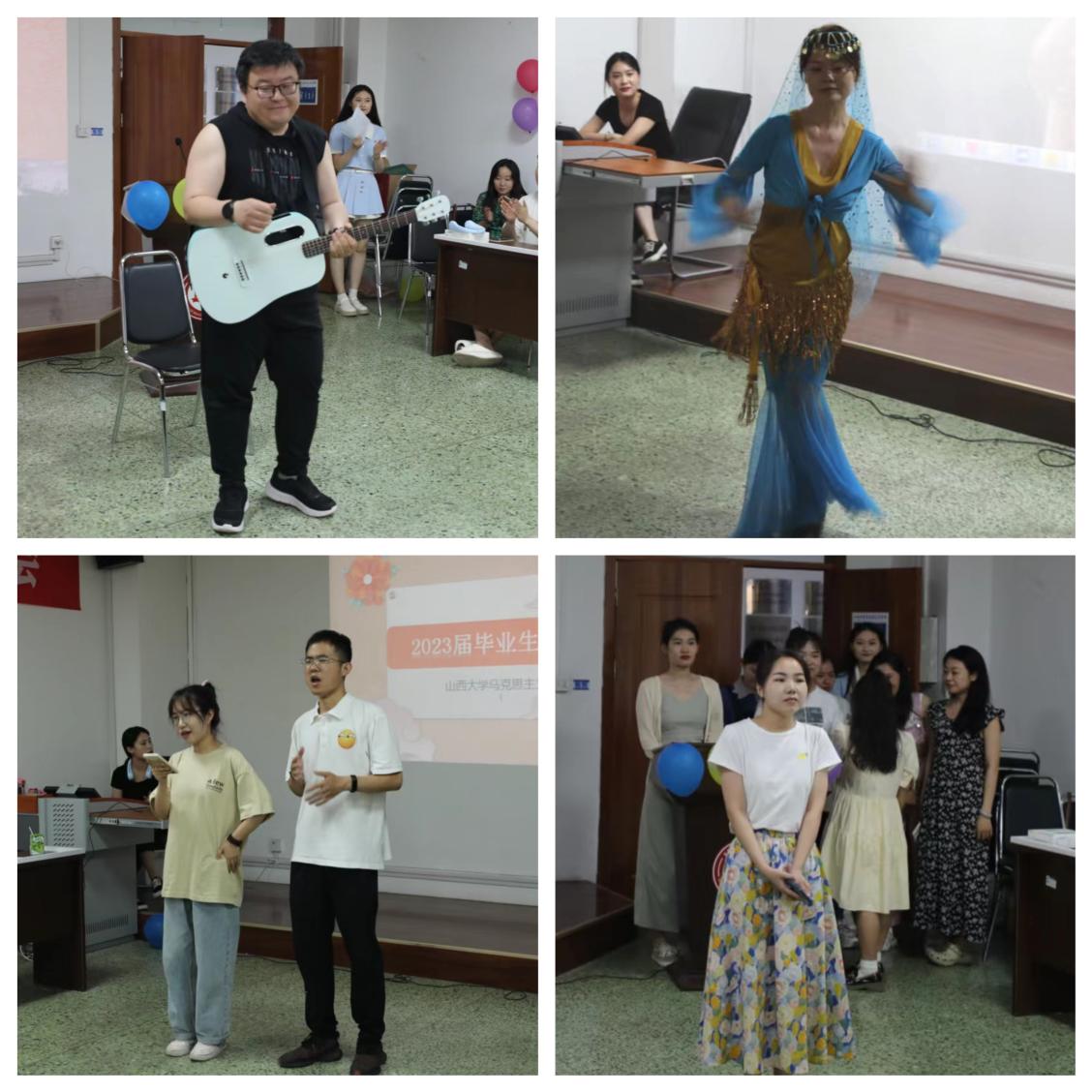 现场的老师和同学们还通过表演节目的方式为毕业生送上了祝福。邓韬老师用吉他弹唱的方式呈现了《从前的笑脸》和《再见》两首歌曲,唤起了同学们对三年校园生活的回忆。姬会然老师精心准备了舞蹈《天竺少女》,展现了青春与韵律之美,希望同学们在今后的工作生活中能永葆青春活力。毕业班刘亚光等同学合唱了一首经典曲目《朋友》,用歌声表达了彼此间深厚的情谊。2022级硕士研究生王蓉和王思扬合唱了歌曲《凤凰花开的路口》,表达了对学长学姐的依依不舍之情和对未来的美好期待。王思扬同学还带来的精彩的相声贯口《莽撞人》,给现场营造了轻松愉快的氛围。此外,欢送会还安排了有趣的“你画我猜”和紧张激烈的“抢凳子”等游戏,一系列精彩节目和游戏,让大家尽情享受相聚的时光,为毕业生留下了一份难忘的记忆。