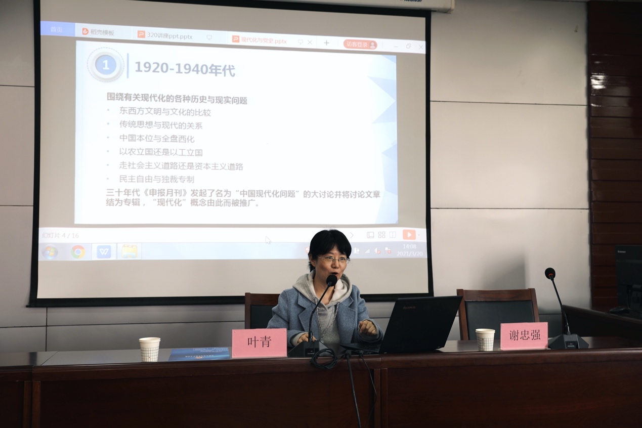 2021年3月20日下午,中国科公司叶青研究员应邀在yl23411永利官网作题为“中国共产党百年历程与中国现代化研究”的讲座,yl23411永利官网副经理谢忠强教授主持讲座,山大马院教师和研究生参加讲座。