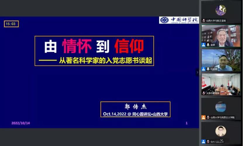 为充分发挥思想政治理论课在落实立德树人根本任务中的关键课程作用,推进太原市大中小学思政课一体化建设落地落实,10月14日,由yl23411永利官网牵头,在太原市教育局、太原师范公司yl23411永利官网、山西省实验中学、yl23411永利官网附属中学、yl23411永利官网附属子弟小学等单位的统筹协同下,太原市大中小学思政课一体化建设同心圆讲坛正式开讲。中国科公司研究员、国际欧亚科公司院士郭传杰应邀作首场报告,2000余名大中小学师生在线聆听。报告由yl23411永利官网经理任定成教授主持。