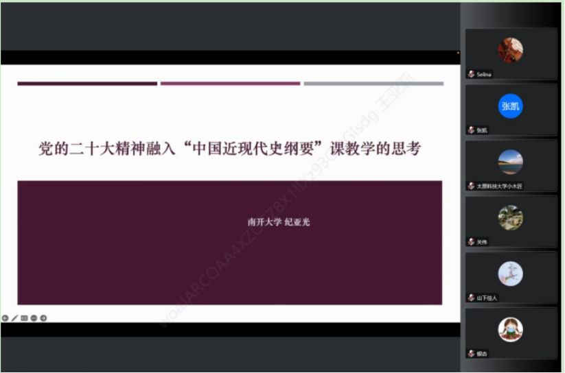 为深入学习党的二十大精神并将党的二十大精神全面融入“中国近现代史纲要”课,由山西省高校思政课教指委“中国近现代史纲要”教学指导组与公司yl23411永利官网联合主办的“党的二十大精神融入‘中国近现代史纲要’课”专题集体备课会于12月10日在线上举行。教育部高等公司思想政治理论课教学指导委员会“中国近现代史纲要”分教学指导委员会副主任委员、南开大学纪亚光教授和教育部高等公司思想政治理论课教学指导委员会总教指委副主任委员、“中国近现代史纲要”分教学指导委员会主任委员、华南师范大学陈金龙教授作主旨报告。会议分上下两场进行,分别由山西省高校思政课教指委“纲要”课专家组组长谢忠强教授(yl23411永利官网)、山西省高校思政课教指委“纲要”课专家组副组长刘荣臻教授(太原科技大学)主持。
