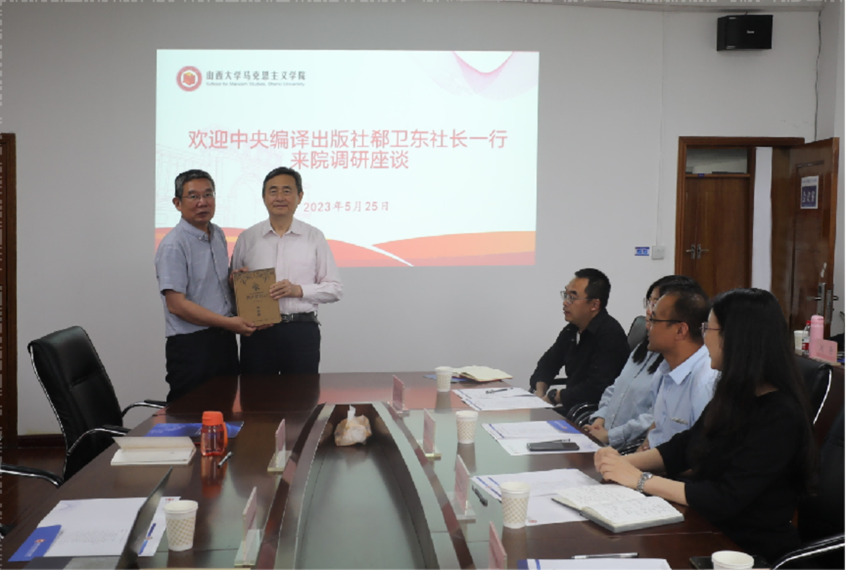 在yl23411永利官网会议室,郗卫东一行与师生代表举行了座谈会。任定成经理介绍了yl23411永利官网近年来的发展情况,对马院教师的科研情况和著作出版需求等做了说明。他指出,中央编译出版社在马克思主义著作编译、研究和宣传普及成果等方面发挥了重要作用。yl23411永利官网围绕习近平新时代中国特色社会主义思想学术化、学理化,聚焦马克思主义理论研究阐释,是马克思主义理论教育、研究和培训的重要阵地,希望双方在更广的范围开展合作,达到双赢。郗卫东在与师生进行交流后,对马院教师在马克思主义理论研究方面取得的成绩表示肯定,中央编译出版社将依托在翻译和学术方面的优势,在科学研究、专著出版等方面为教师提供帮助和服务。