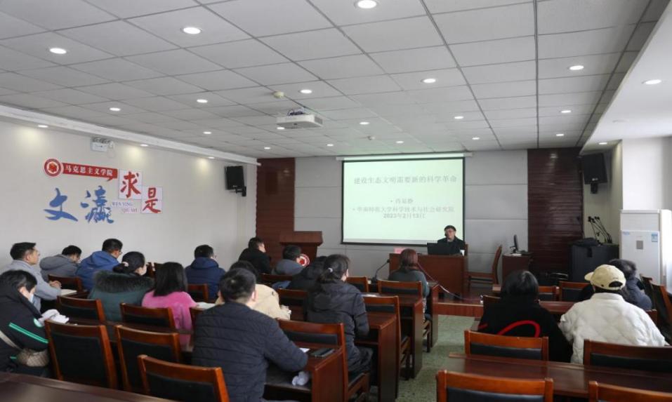 2月13日,华南师范大学特聘教授肖显静应邀在yl23411永利官网作“建设生态文明需要新的科学革命”的报告,马克思主义中国化研究教研室主任张利萍教授主持报告会。
