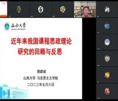 思想政治教育教研室讲师郭建斌以《近年来我国课程思政理论研究的回顾与反思》为题,指出课程思政研究欲取得突破性的进展需明确课程思政研究的问题域,强化课程思政理论研究,处理好课程思政与思政课程的关系。王树荫教授和张云飞教授对报告选题意义和研究可行性给予了肯定,认为报告中对课程思政的政策梳理具有一定价值,可借此开展相关政策的文本研究,紧密与现实相结合。