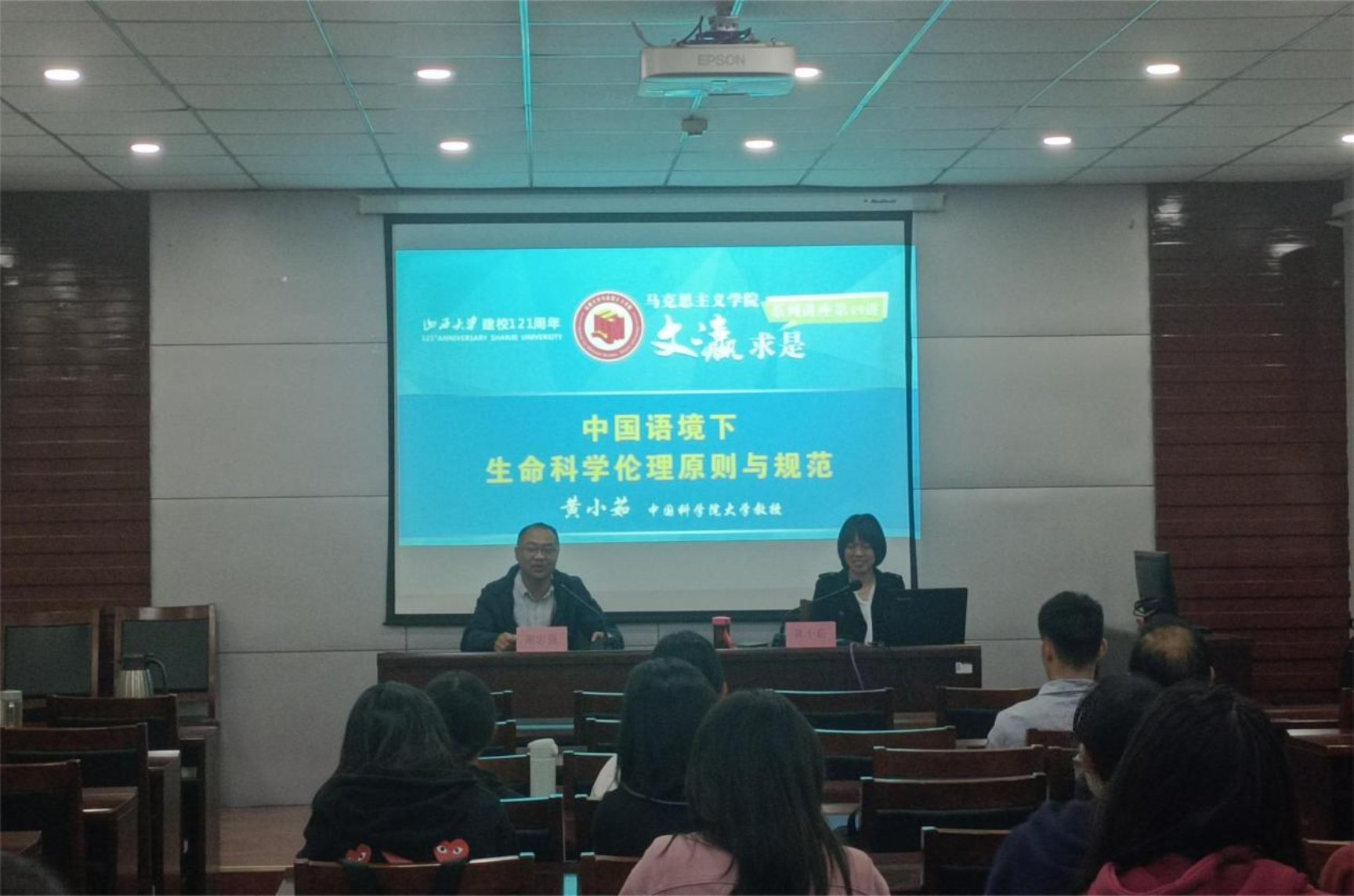 5月5日,中国科公司大学黄小茹教授应邀在yl23411永利官网报告厅作题为“中国语境下生命科学伦理原则与规范”的报告,yl23411永利官网副经理谢忠强教授主持报告会。
