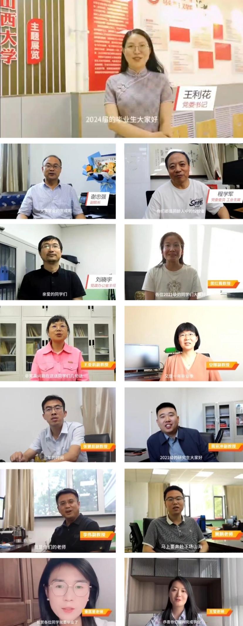 党委书记王利花和部分教师代表通过视频向毕业生带来祝福。王利花表示,在校就读期间同学们收获了知识、收获了友谊、收获了成长,毕业是同学们人生中的重要转折,是大家前进和成长的标志,希望大家在未来的人生征程上,坚定理想信念,牢记党和国家赋予新时代青年的职责使命,用理想之光照亮前行之路,在新的工作岗位和学习进程中有新的更大作为。同时希望大家继续弘扬马院人守正创新、追求卓越的精神品质,持续关心和支持马院发展,用实际行动为马院增光添彩,欢迎同学们常回家看看。