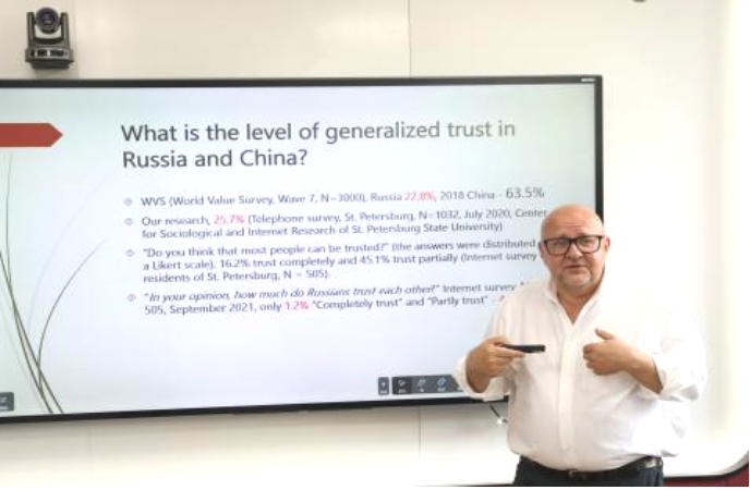 韦谢洛夫的讲座题为“Digital Trust and Social Transformation:The Marxist Approach”。他结合时代热点从“信任”引出“数字信任”,通过对比不同维度类型的信任半径、信任动态趋势、宗教与道德问题、市场经济与信任传播问题,指出信任发展逻辑与社会经济现代化普遍规律一脉相承,在当今数字化的世界中,数字信任的广泛传播将会深刻影响现代社会的信任水平,可以通过建立技术系统的信心减轻数字危害的风险。