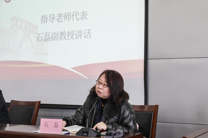 石磊副教授代表宣讲团指导教师发言,她介绍了宣讲团的主要任务和作用,指出宣讲团成员要坚持“马院姓马,在马言马”理念,将宣传马克思主义理论和党的路线、方针、政策作为自己的分内职责,自觉做习近平新时代中国特色社会主义思想的坚定践行者。她表示自己将与各位指导老师一起努力,为各位成员的成长和宣讲团的发展壮大贡献力量。